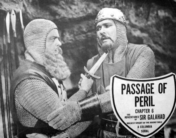 Above: John Merton, looking rather like a murderous Santa Claus, gets acrimonious with his lieutenant (Don Harvey) in Adventures of Sir Galahad (Columbia, 1949).