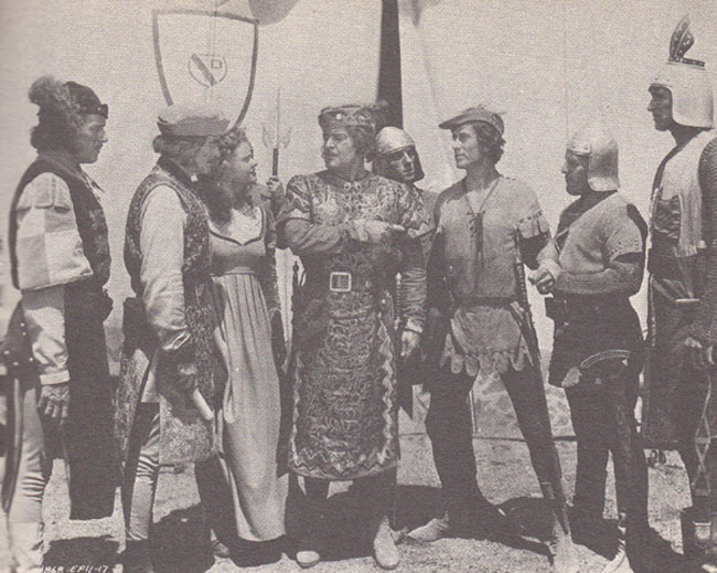 Merton’s final Columbia serial was The Adventures of Sir Galahad, a medieval chapterplay like Son of the Guardsman but far more enjoyable than that serial. George Reeves starred as Galahad, while Merton played Ulric, King of the Saxons, who was plotting to conquer King Arthur’s Britain; he and his Saxons caused a lot of trouble for both the Knights of the Round Table and the mysterious and treacherous Black Knight, with whom they eventually allied only to be defeated. As in Guardsman, Merton’s combination of ferocity and arrogance suited him well for the part of a war lord; he had a lot more screen time here than in his first medieval-serial role, and made the most of it–gloating, glaring, and snarling with entertaining gusto.
