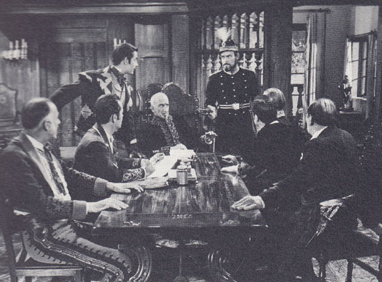 Above: Accused of treason, John Merton makes a dramatic exit from the council chamber in Zorro’s Fighting Legion (Republic, 1939). Leander De Cordova is seated at the head of the table, while Reed Hadley (as Don Diego/Zorro) is standing.