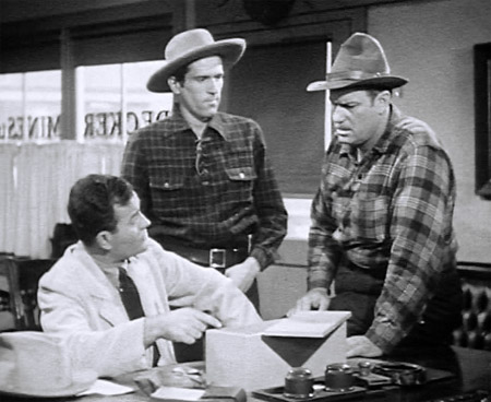Above: Richard Alexander watches nervously as Buck Jones (center) and Leo Carrillo, seeking to bluff him into a confession, discuss using him as a trick-shooting target in Riders of Death Valley (Universal, 1941).
