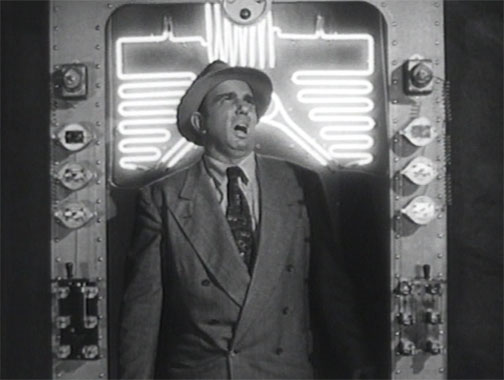 Above: “Let me outa here!” A panicked Rusty Wescoatt is about to be sent to the Empty Doom via the “Main Arc” in Atom Man vs. Superman (Columbia, 1950).