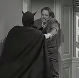 Above:  “I didn’t slug myself!” Rusty Wescoatt insists to a sceptical Lee Roberts that Batman has just been on the scene in Batman and Robin (Columbia, 1949).