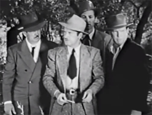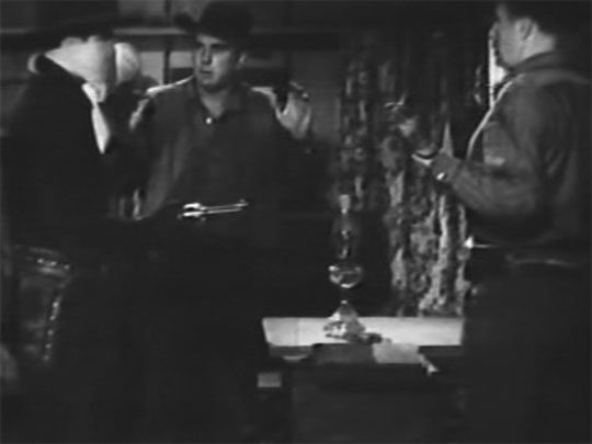 Wescoatt’s next chapterplay appearance was in Tex Granger (Columbia, 1948), as as one of the members of an outlaw gang led by the badman Reno (Jack Ingram).  Reno’s outfit was secondary to the serial’s principal team of bad guys, and thus Wescoatt’s screen appearances here were brief and sporadic; he was given a few opportunities to glower irritably and lie unconvincingly when trying to deceive kid sidekick Buzz Henry, and also became briefly prominent in the serial’s chapter, when he and fellow-henchman Eddie Parker succeed in unmasking hero Tex Granger (Robert Kellard) as the villains’ opponent, the “Mystery Rider.”  The excited Wescoatt and Parker tried to sell this news to the other villains, but were ungratefully gunned down by their rival outlaws before they had a chance to share the secret.