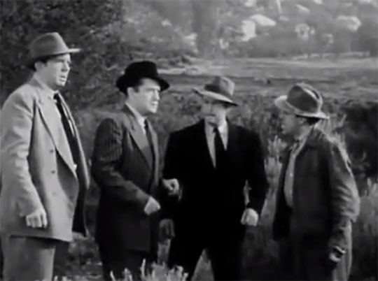 Above, left to right: Charles King, Jack Ingram, John Hart (partially hidden behind Ingram) and Rusty Wescoatt look wary as they try to cope with an invisible antagonist in Brick Bradford (Columbia, 1948).