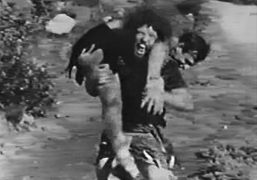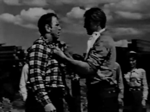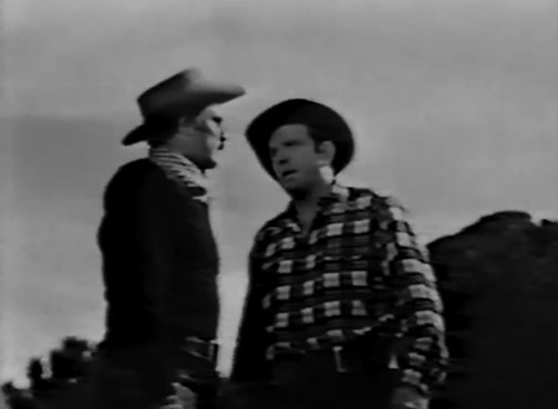 Above: Jock Mahoney admonishes a temporarily subdued Rusty Wescoatt at the end of a protracted stuntman-versus-wrestler fight in Roar of the Iron Horse (Columbia, 1951), as Virginia Herrick watches approvingly from the background.