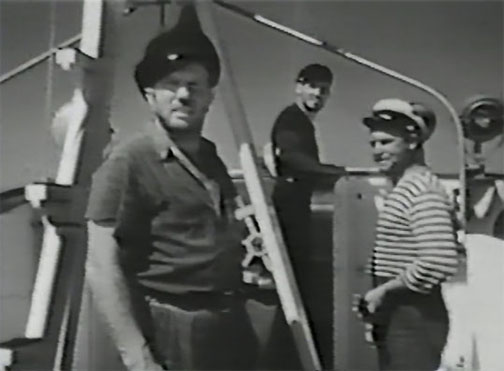 Above: Rusty Wescoatt grins happily as he operates a mechanism which will hold the off-camera Buster Crabbe and Ralph Hodges underwater in The Sea Hound.