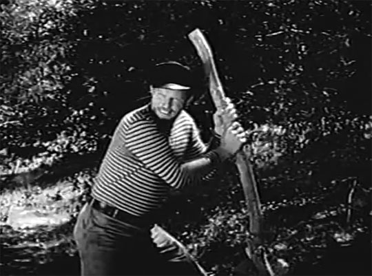 Wescoatt’s final serial, King of the Congo, was not one of Katzman’s stronger efforts, but it gave Rusty his single most colorful role and resulted in his most entertaining performance.  This chapterplay starred Wescoatt’s frequent screen antagonist Buster Crabbe as Roger Drum, an US Air Force captain who came to Africa to investigate Communist activities there and became the Tarzan-like champion of a surviving Stone Age tribe called the Rock People.  Wescoatt played Kor, the savage leader of a rival tribe of stone-agers called the Cave Men; this tribe’s repeated attacks on the Rock People complicated Drum’s struggles against a gang of Communist agents (led by Leonard Penn).  The Communists subsequently attempted to exploit the feud between the two tribes, and armed Kor and his followers with modern weapons.  However, when the Reds refused to abide by the outcome of a one-on-one combat in which Drum fairly bested Kor, the caveman’s primitive sense of honor caused him to turn on the villains, and he finished the serial in the good guys’ camp, even making peace with the Rock People.  Wescoatt cut loose completely in this very unusual role, and went consistently and hilariously over the top–laughing and grimacing like a maniac when pleased, roaring and growling like the Wolf Man when displeased, and engaging in amusing bits of physical business whenever he got the chance (such as abruptly poking Penn with his stone axe in order to remind him of his promise to provide new weapons).  His wild performance felt perfectly suited to his wildly uncontrollable character, and allowed him to steal every scene in which he appeared, particularly the sequence in which the Communists unwisely tried to teach him how to use rifles and hand grenades.