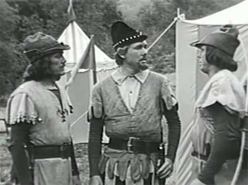 Above: Rusty Wescoatt brings news to Don C. Harvey (center) in Adventures of Sir Galahad (Columbia, 1949).  Pierce Lyden is on the far left.