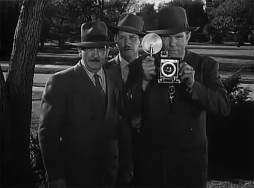 Above: Charles King (far left) and Jack Ingram watch as Rusty Wescoatt eliminates a couple of off-camera security guards with a dart-shooting camera in Superman (Columbia, 1948).
