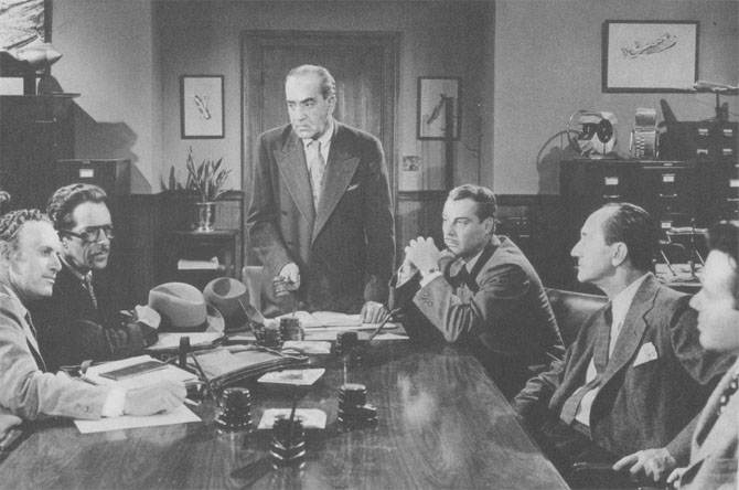 Above, from left to right: Stanley Price, I. Stanford Jolley, Ted Adams, Tristram Coffin, Marshall Bradford, and House Peters Jr. in King of the Rocket Men (Republic, 1949).