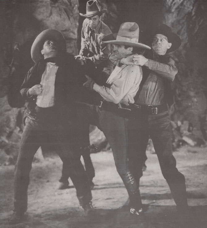 Above: Tom London (far right) and Edmund Cobb battleTom Mix, while Stanley Price watches from horseback in The Miracle Rider (Mascot, 1935).