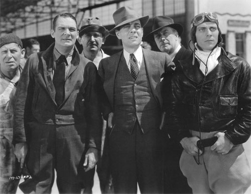 Above, left to right: Horace Murphy, an unidentified player (in far background), Walter Miller, Bud Osborne, Charles A. Browne, another unidentified player, and Dennis Moore in Tailspin Tommy (Universal, 1934).