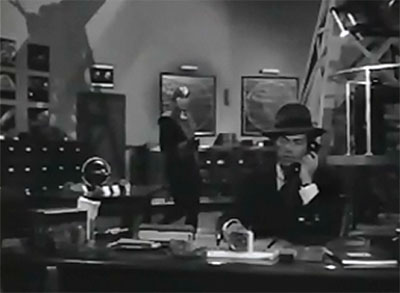 Above: Dennis Moore makes a phone call as Roy Barcroft sneaks up on him in The Purple Monster Strikes (Republic, 1945).