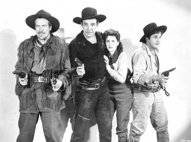 Above, left to right: Don Terry, Lon Chaney Jr., Helen Parrish, and Noah Beery Jr. in a publicity still for Overland Mail.