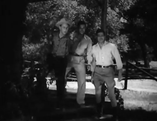Hodges’ third and last 1940s serial was Bruce Gentry (Columbia, 1949), in which he was cast as a young rancher named Frank Farrell–who, together with his sister Juanita (Judy Clark), helped the titular pilot-adventurer (Tom Neal) track down a band of foreign agents and stop them from conquering the world with a fleet of flying saucers. Marred by unconvincing cartoon-saucer effects and an over-padded narrative, but enlivened by a good cast and some solid action scenes, Gentry was more than a little uneven–but definitely gave Hodges the biggest and best of his serial-sidekick roles; in Sea Hound (and in his next and last serial) he was just one member of a squad of supporting heroes, but in Gentry he was the hero’s only regular male aide, receiving plenty of screen time and figuring in plenty of action. He conveyed a level-headedness and self-reliant toughness appropriate to his rancher character, and also established a good rapport with both hero Neal and heroine Clark; his good-natured bantering with the two provided the serial with several of its brighter moments.