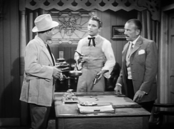 Above: “Stay put, will ya? Those guns make me nervous.” Robert Armstrong mocks Milburn Stone (far left) after Stone has been disarmed by Armstrong’s henchman Danny Morton in The Royal Mounted Rides Again.