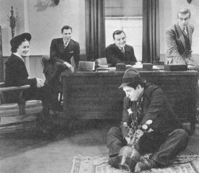 Above: Smiley Burnette gets his hand stuck in a flower vase in Dick Tracy (Republic, 1937), to the amusement of (left to right) Kay Hughes, Richard Beach, Ralph Byrd, and Fred Hamilton.
