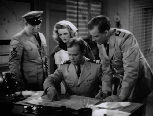 Above: Walter Sande (seated), Edgar Dearing, Elyse Knox, and Don Terry (standing left to right) figure out where the Scorpion and his allies plan to strike next in Don Winslow of the Coast Guard (Universal, 1942).