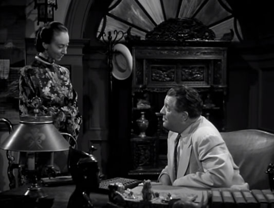 Above: Cy Kendall smirks as he evades the questions of Victoria Horne in Secret Agent X-9 (Universal, 1945).