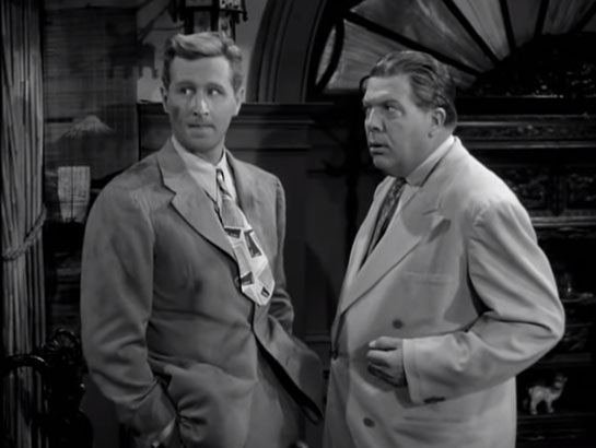 Above: Cy Kendall ponders some evidence and comes to the wrong conclusion in Mystery of the Riverboat (Universal, 1944), as Lyle Talbot watches.