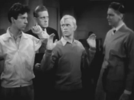 Above: Gene Roth has the drop on Ward Wood (far left) and Billy Benedict (center) in Adventures of the Flying Cadets (Universal, 1943); Louis Adlon is on the far right.