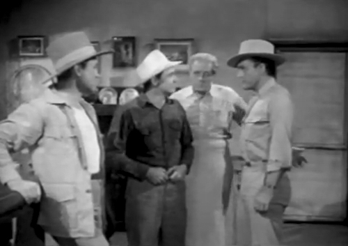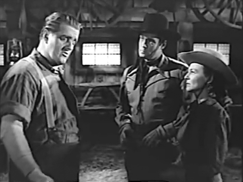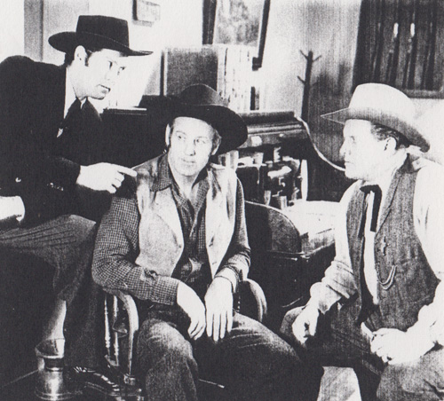 Above: Clayton Moore questions Roy Barcroft as Gene Roth watches in Jesse James Rides Again (Republic, 1947).