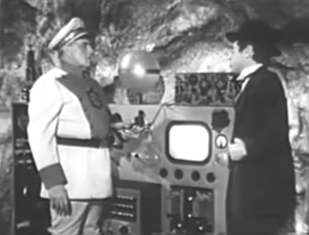 Above: Assisted by Rusty Wescoatt, a cheerful Gene Roth prepares to blow up the good guys in Mysterious Island.