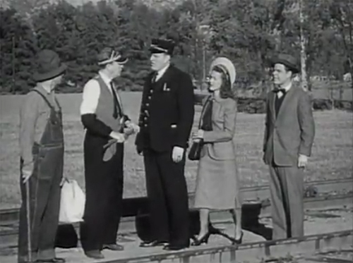 Above: Gene Roth questions a workman (Jack George, far left) and a stationmaster (unidentified) about an averted train crash, while Noel Neill (as Lois Lane) tries to cut in on the conversation and Tommy Bond (as Jimmy Olsen) watches in Superman (Columbia, 1948).