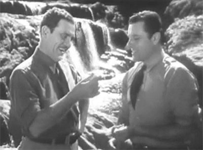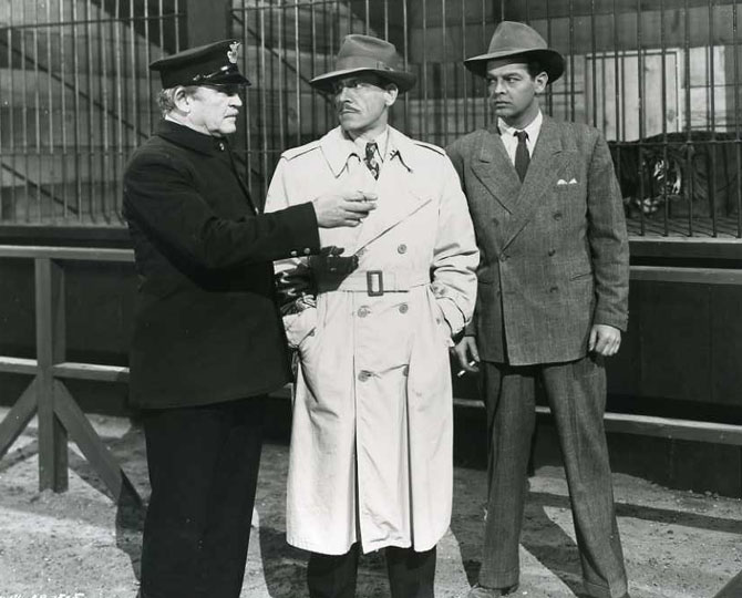 Above: Zookeeper Bud Osborne directs Kenneth MacDonald and Robert Lowery to the gorilla cage in The Monster and the Ape (Columbia, 1945).